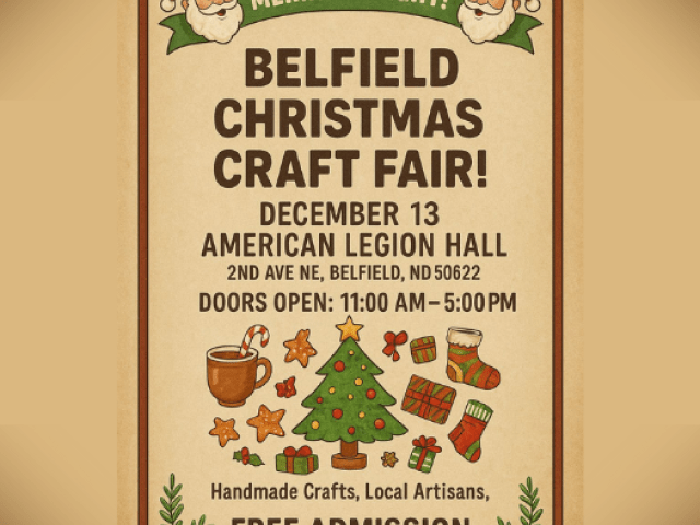 Head to Belfield's American Legion Hall on Saturday, December 13th for the Belfield Christmas Craft Fair. Doors will open at 11 AM to check out vendors and local artisans. Free admission.