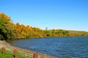 Woodlands around the lake are brightly lit with color when the leaves start to change.