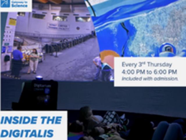Join us every third Thursday from 4:00 pm to 6:00 pm for planetarium shows every 15 minutes inside our Digitalis Dome.
