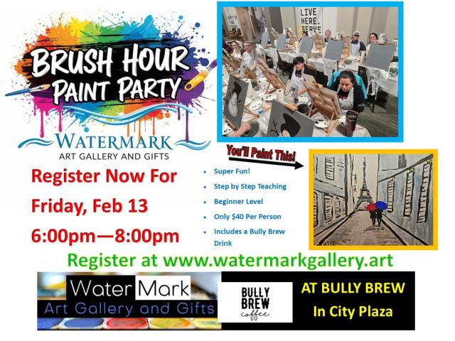 This month's Brush Hour Paint Party is happening at Bully Brew Coffee Shop at City Plaza in Devils Lake! Our two-hour painting party is designed to be an artistic and social event where participants are taught step by step how to paint their very own masterpiece. Dr. Mark Hale, who is the owner and artist at WaterMark Art Gallery and Gifts, leads the class. His upbeat personality and ability to teach others how to create art will surely put everyone at ease. After all, the event is made to be fun! At the conclusion of the event, you'll get to see how other class members did on their piece of art. It's a real hoot! Most classes last about 120 minutes, but that can vary. Finally, be sure to come ready to shop at WaterMark! We have tons of original art and gifts created by artisans from around the area. Most classes are limited to 16 people.