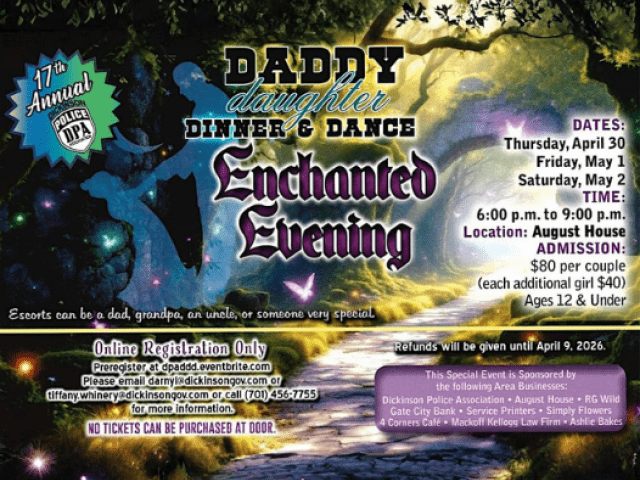The Dickinson Police Association will host the 17th Annual Daddy-Daughter Dinner & Dance at the August House Venue. This year's theme is "Enchanted Evening."