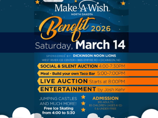 The Dickinson Noon Lions will be hosting their annual Make-a-Wish event on Saturday, March 14, 2026, at the West River Ice Center. The event will consist of: