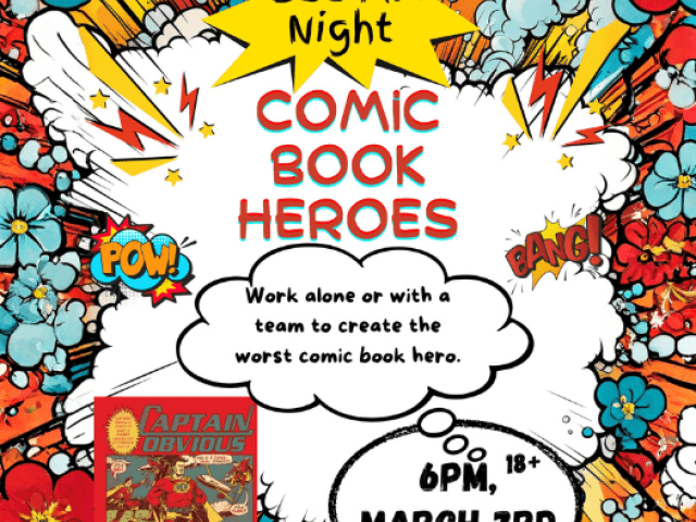 Work alone or with a team to create the worst comic book hero possible with the materials provided. 18+