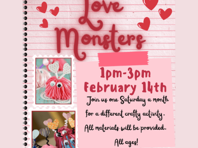 Join us for a special Saturday Craft Club for all ages! Stop in between 1pm and 3pm to make Love Monsters. All supplies provided. All abilities welcome!