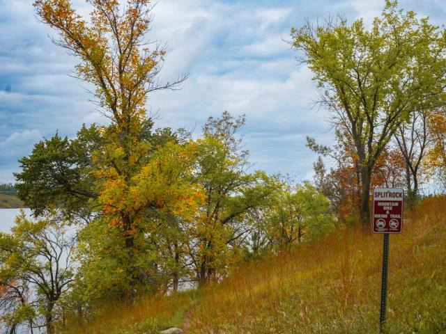 Named for a tree growing through a rock on the trail, Split Rock Trail is 1.8 miles of unpaved trail running parallel to the paved trail at the Jamestown Reservoir. Enter this trail at the face of the dam on the east side or straight across from the North Dakota Game and Fish office.