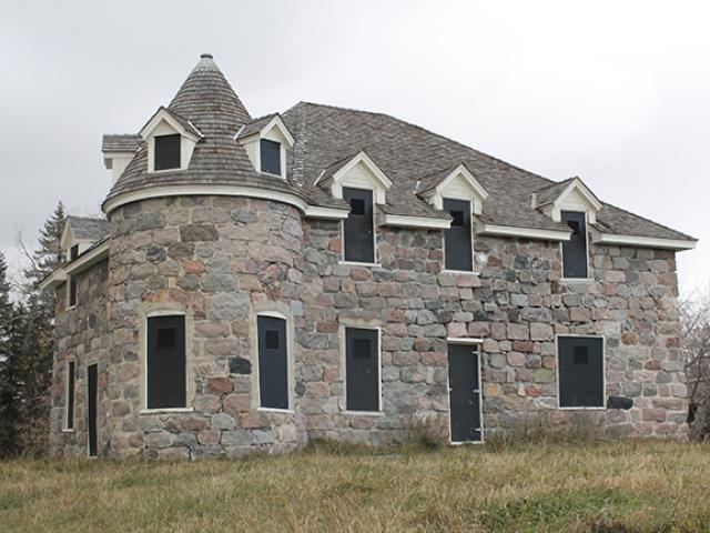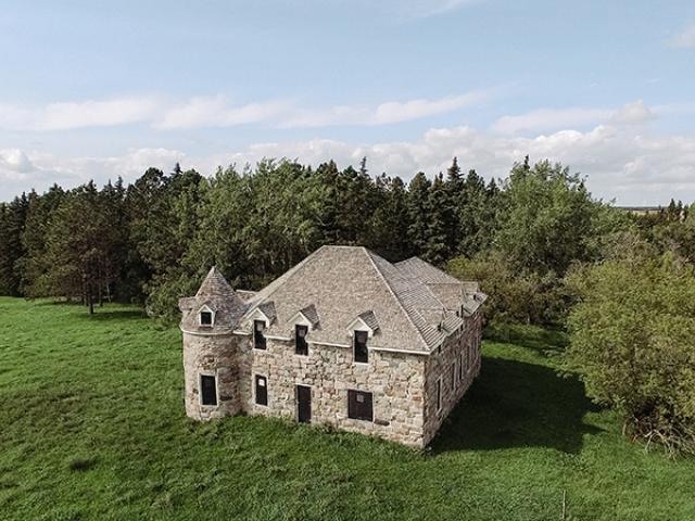 Built between 1906 and 1909, Coghlan Castle (fig. 1) is a large fieldstone farmhouse located on private property approximately five miles north of the town of Rolla in Rolette County, North Dakota (Quinnell and Bentley, 2008). The house was built for Maurice Coghlan, an Irish-born entrepreneur from Boston, to house himself and his family on land he formally homesteaded in 1889 and 1890. It remained occupied until 1948 when the prohibitive cost of heating this large, essentially uninsulated stone structure, forced the then owners to move out. Learn more about the castle here: https://www.dmr.nd.gov/ndgs/documents/newsletter/2008Summer/pdfs/CoghlanCastle.pdf.