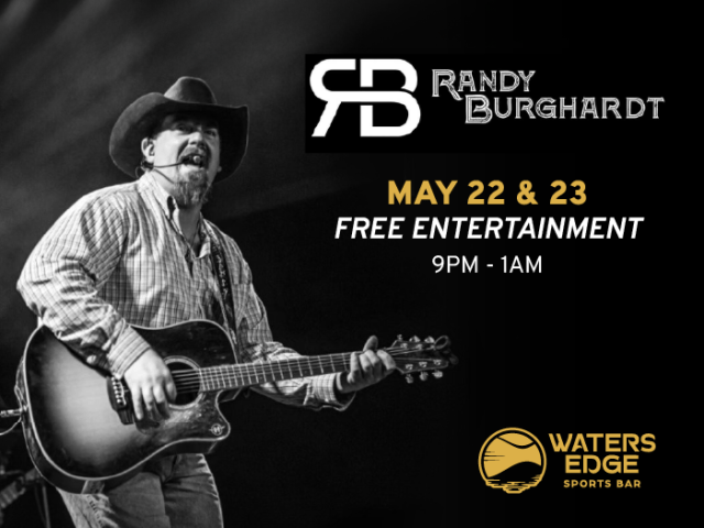 May 22 and 23 from 9PM–1AM, enjoy free live entertainment with Randy Burghardt at Waters Edge Sports Bar. Bringing a high-energy mix of country and classic favorites, Randy delivers a performance that’s equal parts grit, talent, and crowd connection. With strong vocals and a stage presence that pulls you in, he knows how to keep the night moving and the dance floor full. Join us for two nights of great music, cold drinks, and a fun, laid-back atmosphere.